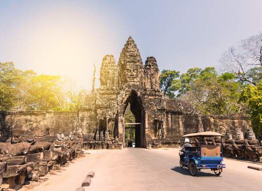 Pequeno-almoço no hotel. Viagem de tuk-tuk (um tipo de veículo típico no Camboja) até ao Portão Sul do complexo de Angkor, onde se pode apreciar as estátuas representando o movimento do oceano, a antiga capital de Angkor Thom (século XII), o templo de Bayon com as suas 54 torres adornadas com 200 rostos sorridentes de Avalokiteshvara, o templo de Phimeanakas, o terraço do rei leproso e dos elefantes, e as câmaras reais. Visita também ao templo de Ta Prohm, um dos templos mais espetaculares da região, onde as ruínas estão "abraçadas" pelas árvores. Almoço num restaurante local.